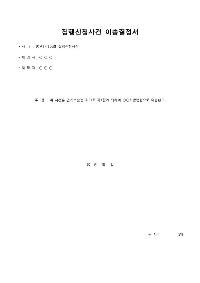 9,000원/월집행신청사건 이송결정서입니다. 사건, 채권자, 채무자 등으로 구성되어 있습니다. 사건에 대해서 지방법원으로 이송을 결정할 때 이송결정서로 작성하여 사용할 수 있습니다.