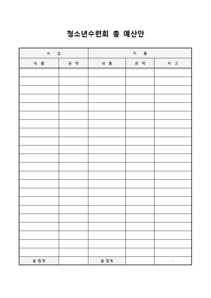 청소년수련회 총 예산안입니다. 수입에 내용, 금액, 지출에 내용, 금액, 비고로 구성되어 있습니다. 학교에서 청소년수련회에 대한 전체적인 예산안을 작성하여 사용할 수 있습니다.