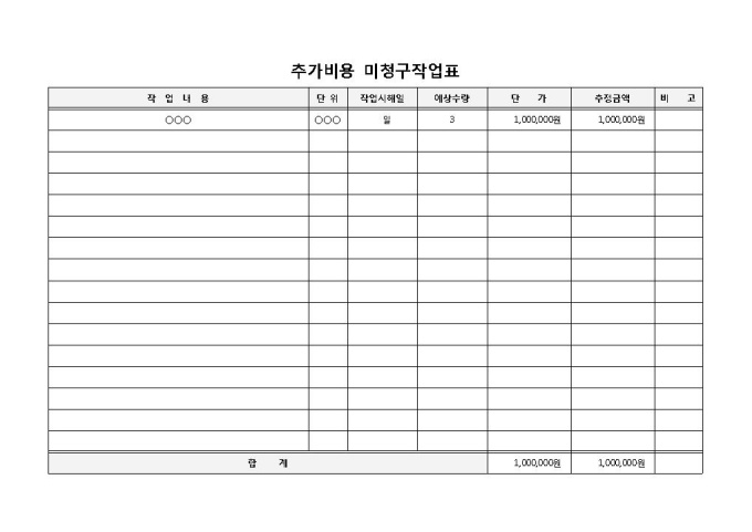 9,000원/월추가비용이 발생했을 시 미청구 작업을 표로 기록하게 만들어 놓은 추가비용 미청구작업표 양식입니다. 작업내용, 단위, 작업시해일, 예상수량, 단가, 추정금액 등의 항목으로 구성되어 있습니다.
