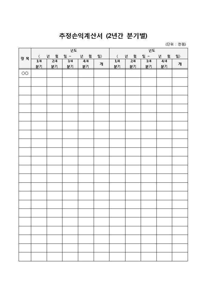 두 개년간의 손익을 분기별로 나눈 뒤 합계를 추정하여 계산하는 추정손익계산서 양식입니다. 항목, 년도별, 합계 등의 항목으로 구성되어 있습니다.