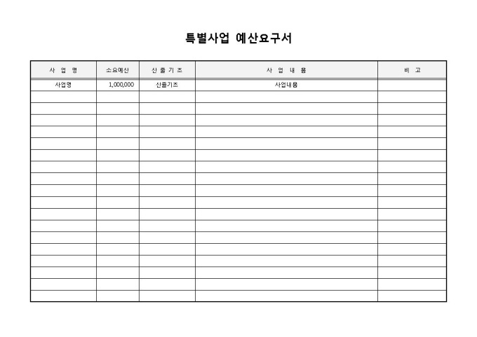9,000원/월특별사업 예산요구서입니다. 사업명, 소요예산, 산출기초, 사업내용 등으로 구성되어 있습니다. 부서에서 기업에게 특별한 사업에 대한 예산을 요구할 때 작성하여 사용할 수 있습니다.