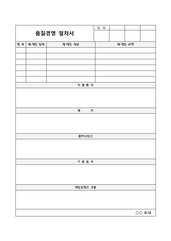 9,000원/월품질 경영 처리의 기준 및 순서, 방법 등을 정하고 규정된 내용을 기록할 때 사용되는 품질경영 절차서 양식입니다. 번호, 제,개정일자, 제,개정사유, 제,개정요약, 적용범위 등의 항목으로 구성되어 있습니다.