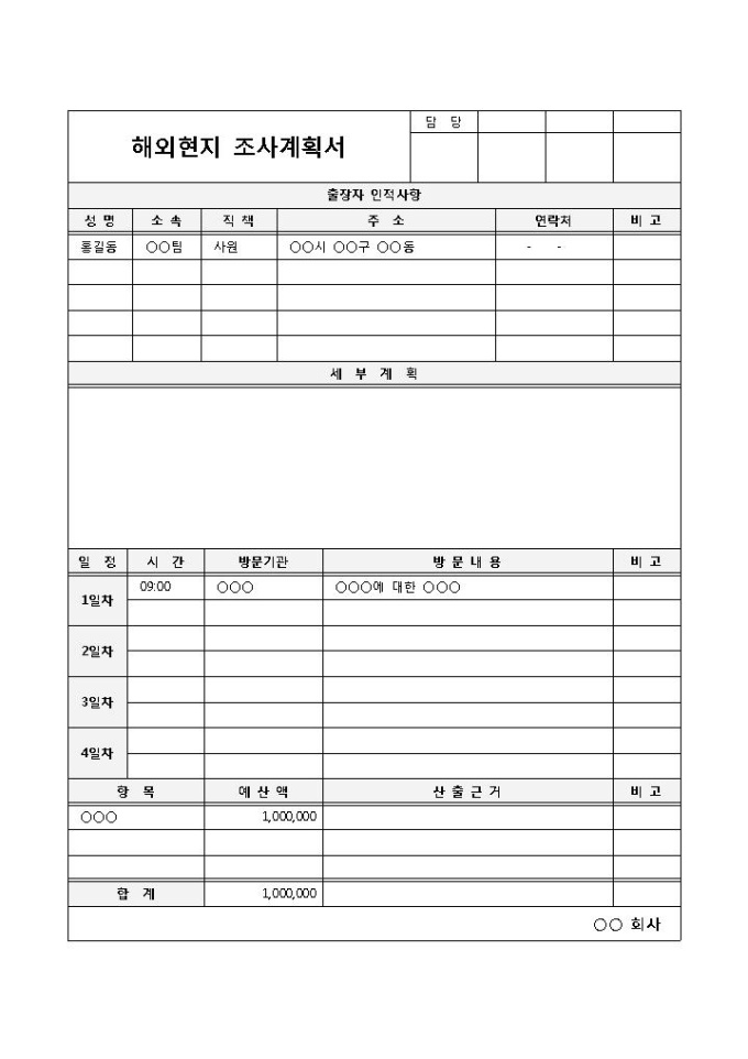 9,000원/월해외현지에서 일정기간 동안 실시할 조사 목표를 표준화된 서식과 절차에 따라 기록할 때 사용되는 해외현지 조사계획서 양식입니다. 출장자의 인적사항, 세부계획, 일정, 시간, 방문기관, 방문내용 등의 항목으로 구성되어 있습니다.