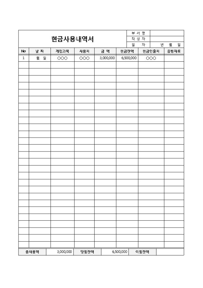 9,000원/월현금의 사용 내역을 사용처, 금액, 잔액, 인출처를 고려하여 기록하고 관리할 때 사용되는 현금 사용내역서 양식입니다. 날짜, 계정과목, 사용처, 금액, 현금잔액, 현금인출처, 총사용액, 당월잔액, 이월잔액 등의 항목으로 구성되어 있습니다.