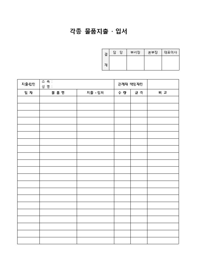 각종 물품지출입서입니다. 각 물품의 지출입처, 수량을 기재한 후 데이터를 토대로 지출입의 출처를 파악할 수 있습니다. 일자, 물품명, 지출입처, 수량, 규격 등으로 구성되어 있습니다.