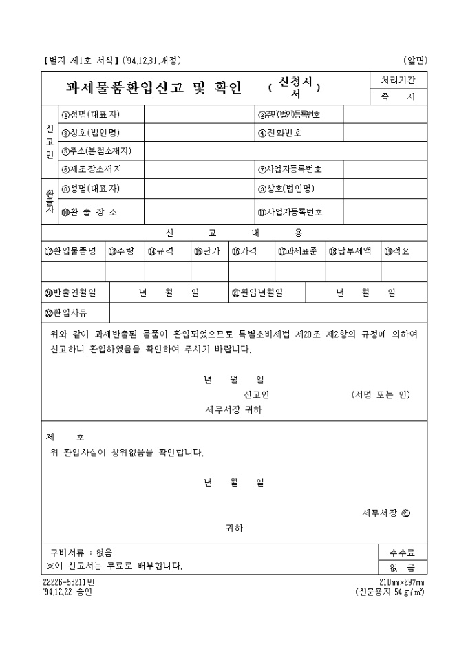위와 같이 과세반출된 물품이 환입되었으므로 특별소비세법 제20조 제2항의 규정에 의하여 신고하니 환입하였음을 확인하여 주시기 바랍니다.
