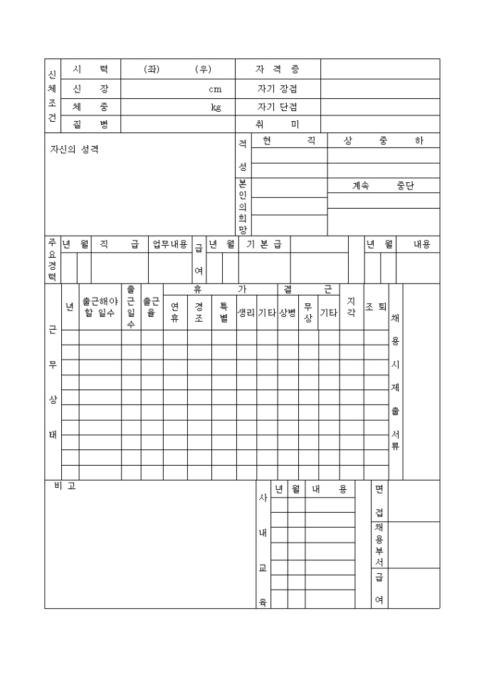 사원의 개인인적사항이나 입사전경력, 가족사항등을 기록하도록 하는 사원카드 양식의 뒷면입니다.
