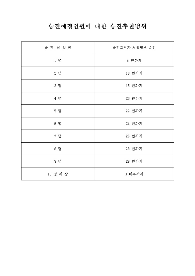 승진예정인원에 대한 승진추천범위에 관한 목록표입니다.