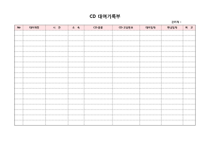 CD 대여기록부입니다. CD 대여 시 작성하는 문서로 일자, 시간, 소속, 대여일자, 반납일자 등으로 구성되어 있습니다.
