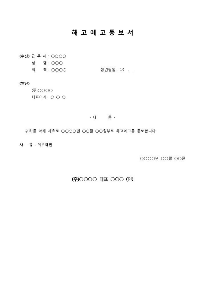 해고예고통보서(변호사)입니다. 수신, 발신, 해고예고 통보, 사유 등의 항목으로 구성되어 있습니다.
