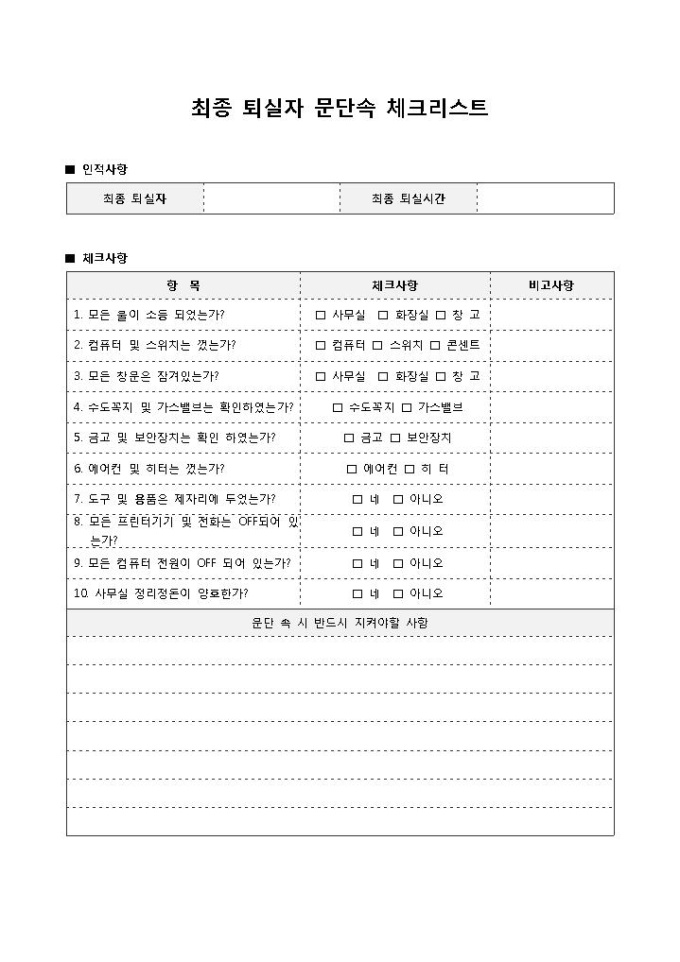 9,000원/월최종 퇴실자 문단속 체크리스트입니다. 최종 퇴실자가 퇴실 시 체크해야하는 체크리스트입니다.