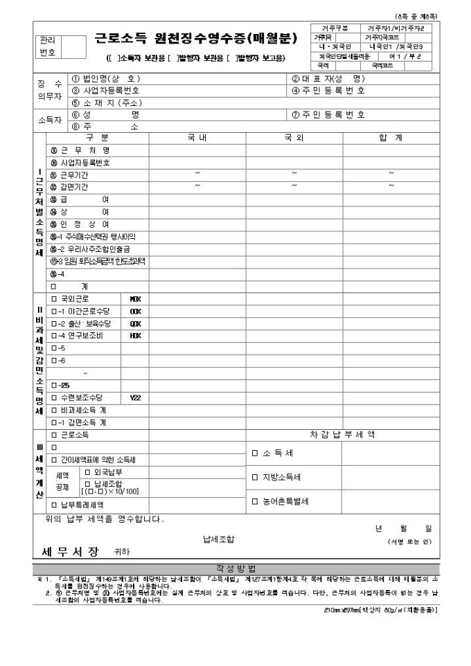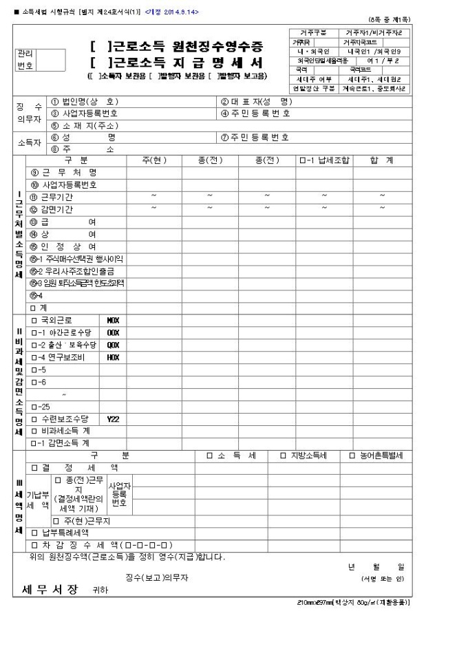 9,000원/월[2014년 연말정산]근로소득원천징수영수증,근로소득지급명세서(2014.3.14 개정)입니다.※ 자료제공 : 국세청
