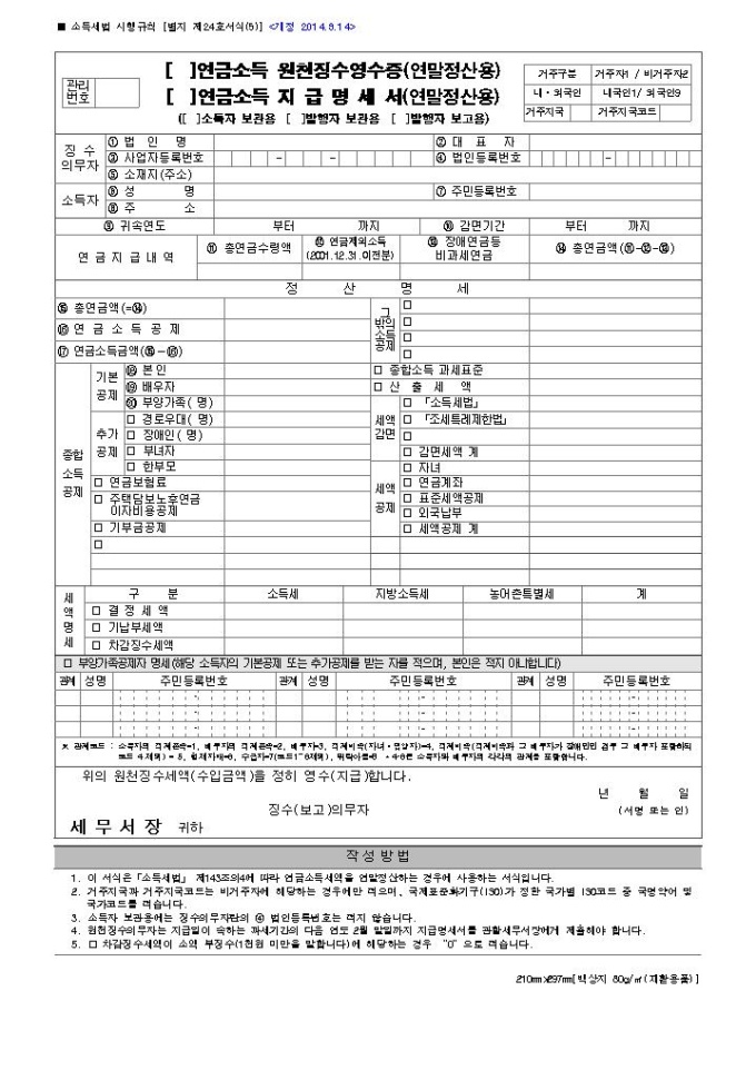 9,000원/월[2014년 연말정산]연금소득원청징수영수증,연금소득지급명세서(연말정산용)(2014.3.14 개정)입니다.※ 자료제공 : 국세청
