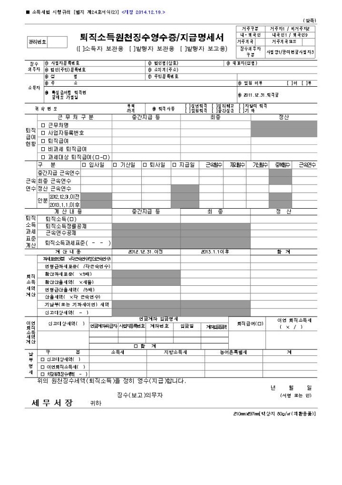 9,000원/월[2014년 연말정산]퇴직소득원천징수영수증,퇴직소득지급명세서(2014.12.19 개정)입니다.※ 자료제공 : 국가법령정보센터