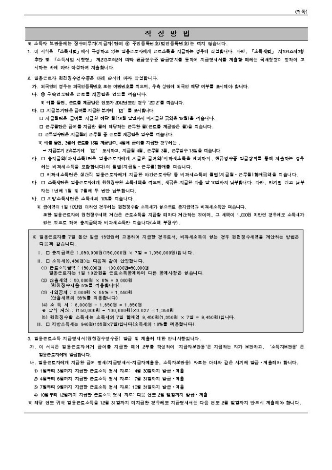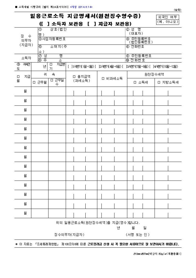 9,000원/월[2014년 연말정산]일용근로소득 지급명세서(원천징수영수증)(2014.3.14 개정)입니다.※ 자료제공 : 국가법령정보센터