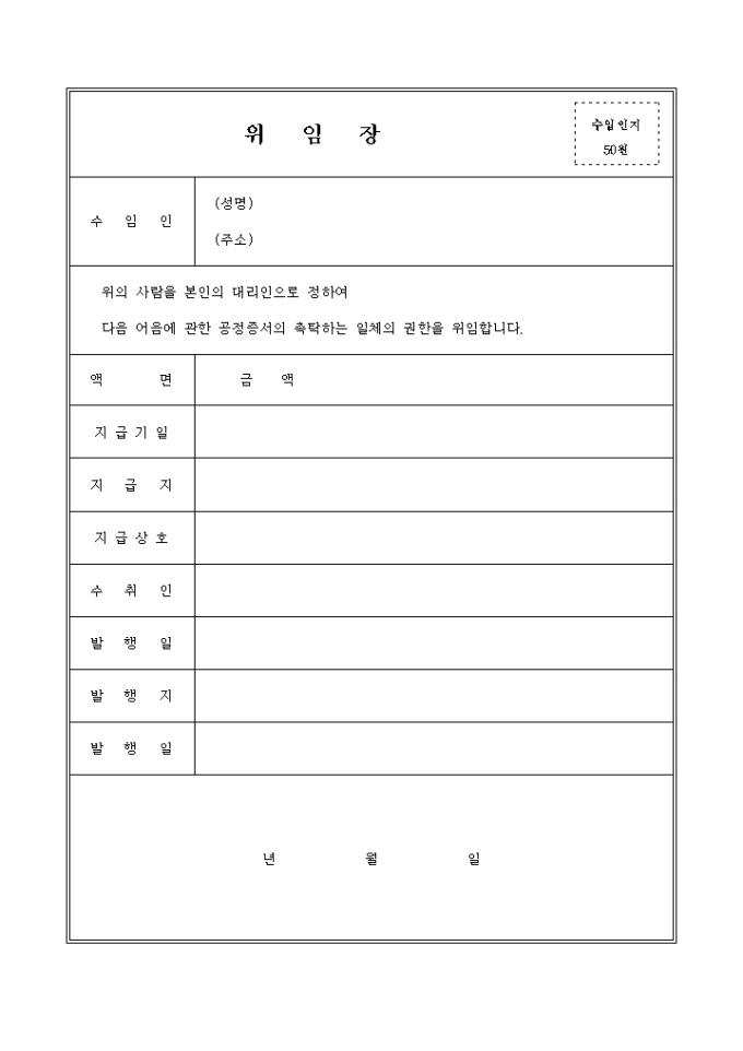 9,000원/월타인을 본인의 대리인으로 정하여 일체의 권한을 위입하는 양식입니다.(어음에 관한 공정증서의 촉탁하는 일체의 권한을 위임하는 내용)