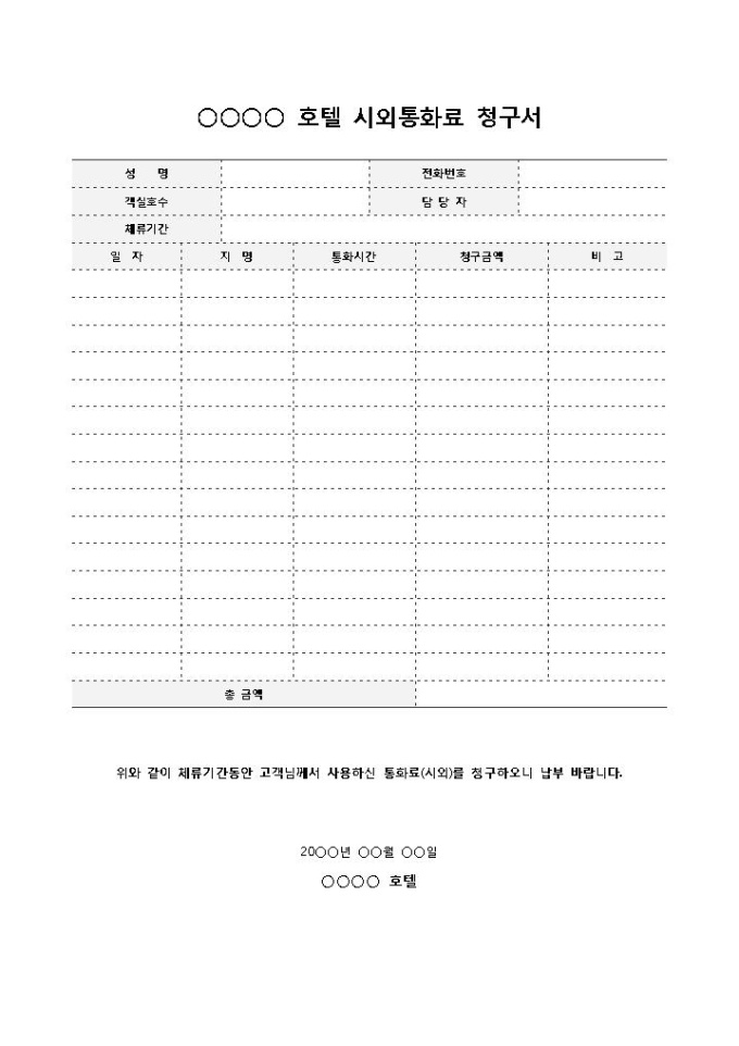 9,000원/월호텔 시외통화료 청구서입니다. 고객이 호텔에 머무는 동안 사용한 시외통화료에 대한 청구서를 작성하고자 할 때 사용하는 문서입니다.