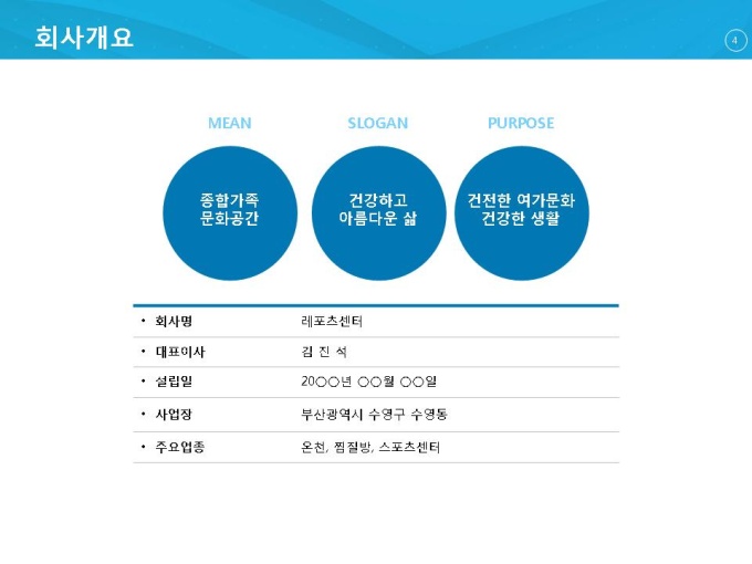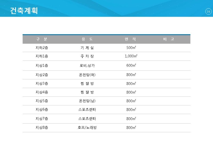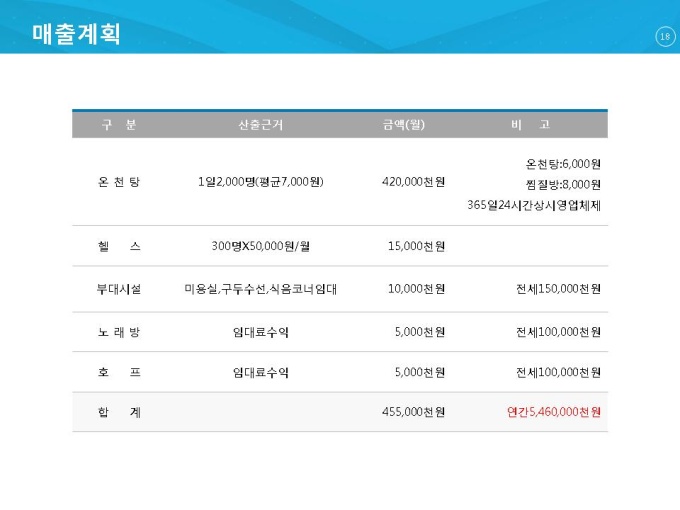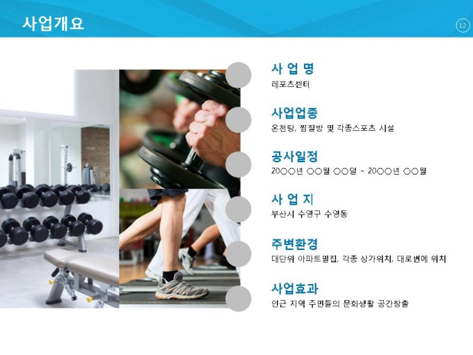 기본적인 사업자 소개와 시장분석을 통해서 사업이 타당한지를 점검하여 사업을 안내합니다. 스포츠, 찜질방, 온천시설이 들어갈 레포츠센터의 건축계획과 자금조달계획을 보여주고 투자자들을 위해 재무계획을 제출하여 설득을 높일 수 있는 사업계획서 양식입니다.