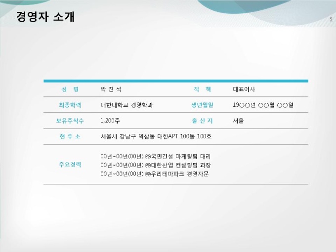 사업자 소개와 사업 진행의 배경과 목적, 구체적으로 어떻게 사업을 진행할 것인지에 대한 내용을 담고 있습니다. 투자자들을 위해 정확한 수익산출의 근거와 재무제표를 제출하여 설득을 높일 수 있는 사업계획서 양식입니다.
