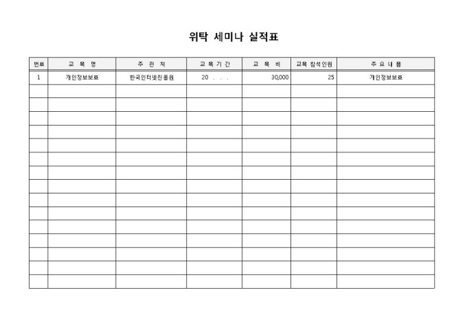 위탁세미나실적표입니다. 위탁세미나에 관한 내용을 작성하는 문서로 교육명, 주관처, 교육기간. 교육비, 교육참석인원. 주요내용 등으로 구성되어 있습니다.