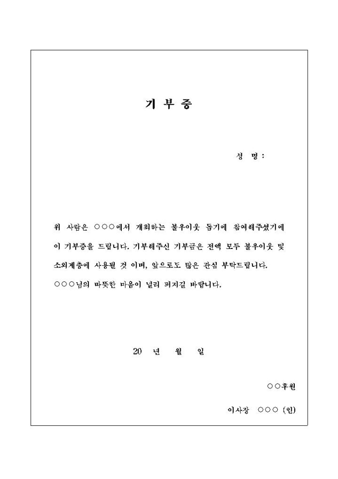 기부증입니다. 기부에 대한 감사와 이를 증명하기 위해 작성하는 문서입니다.