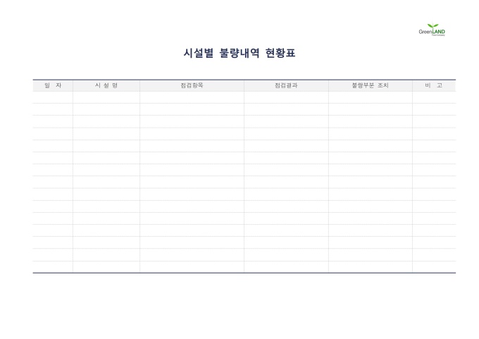 시설별 불량내역 현황표입니다. 시설별 불량내역을 체크하여 작성하는 문서로 시설명, 점검항목, 점검결과, 불량부분 조치 등으로 구성되어있습니다.