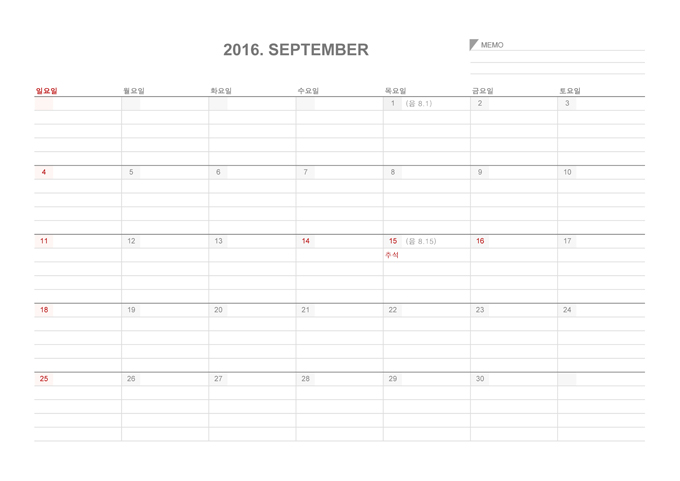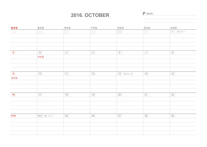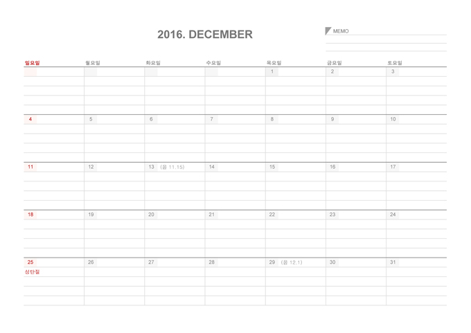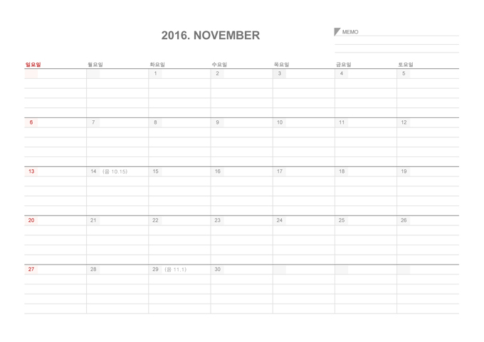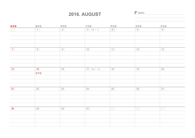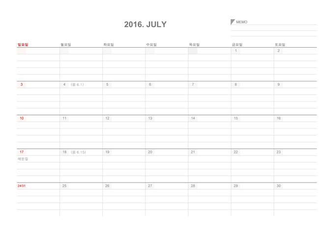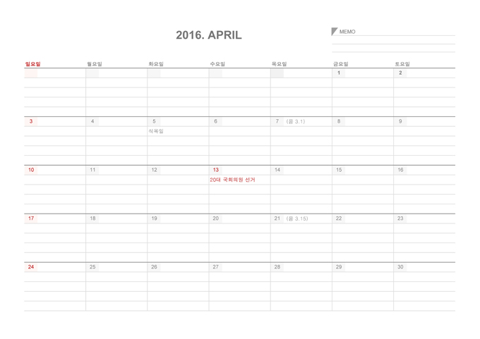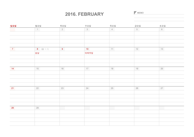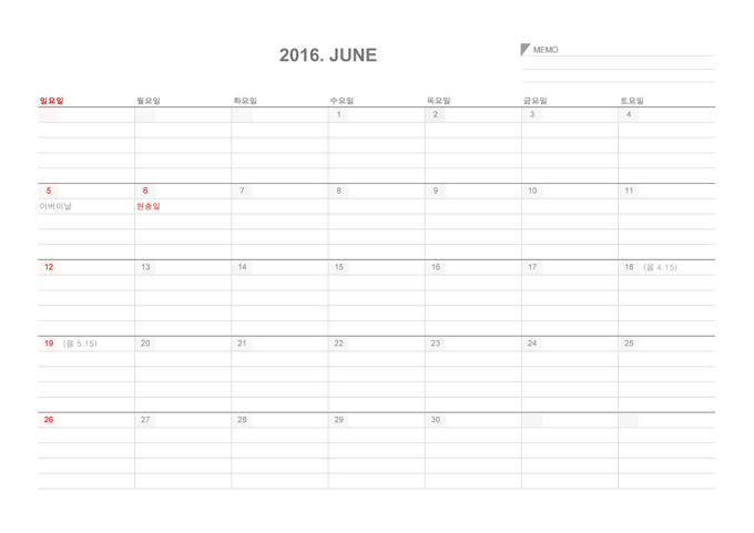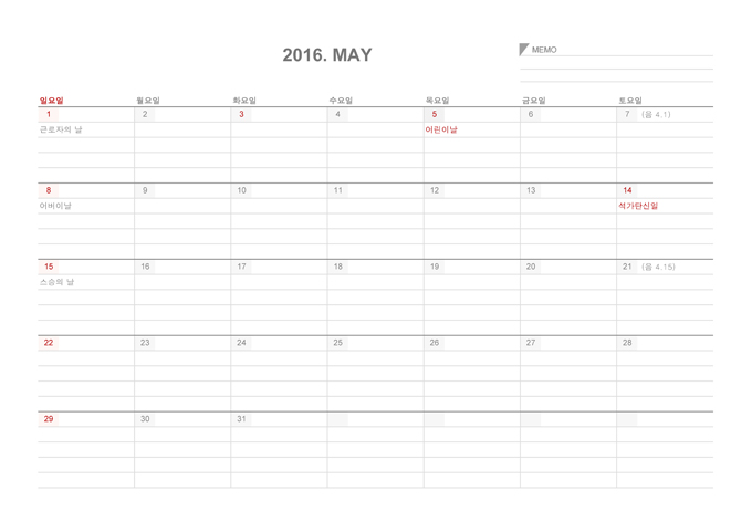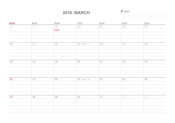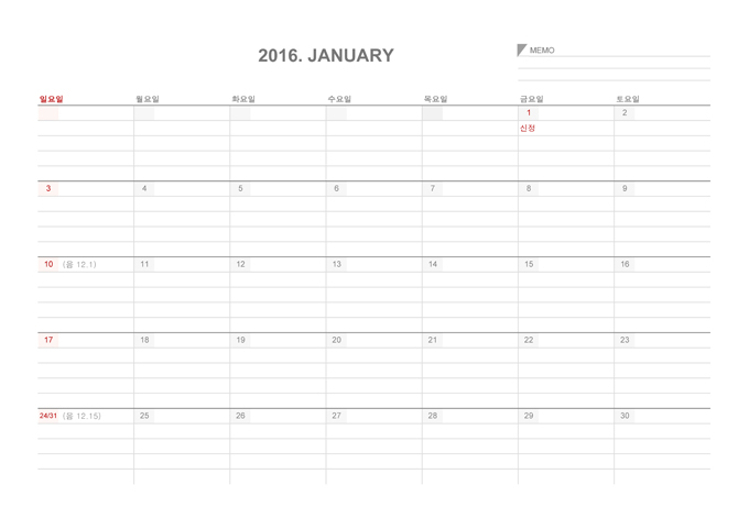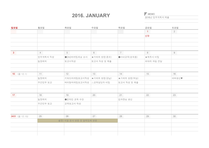 2016년 달력(월별일정,기념일,업무관리)입니다. 일자별로 칸으로 나눠져 있어 기념일 및 업무에 관해 간단히 작성하실 수 있으며, 오른쪽 상단에 메모할 수 있는 공간이 따로 마련되어 있어 중요한 일이나, 문구 등을 작성하실 수 있습니다. 월간일정, 월별달력, 일정관리, 스케줄관리에 효율적으로 사용할 수 있습니다.