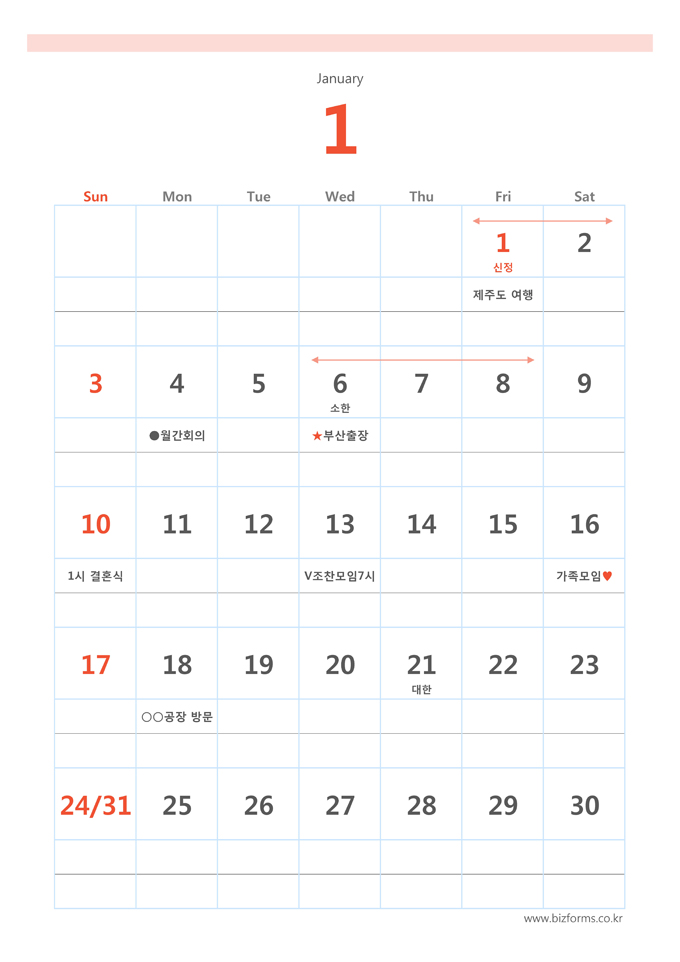 2016년 달력(월별일정,벽부착형)입니다. 다양한 색으로 구성되어있으므로 달마다 다른 컬러를 사용할 수 있습니다. 숫자 하위 부분에 일정, 스케줄 입력창이 있어 새해 업무, 중요사항 등을 체크할 수 있습니다. 월간일정, 월별달력, 일정관리, 스케줄관리에 효율적으로 사용할 수 있습니다. 부착형, 액자형, 다이어리형 등 여러 가지 형태로 다양하게 활용해보세요.