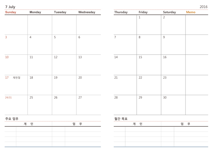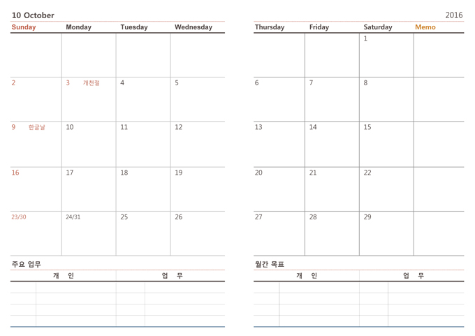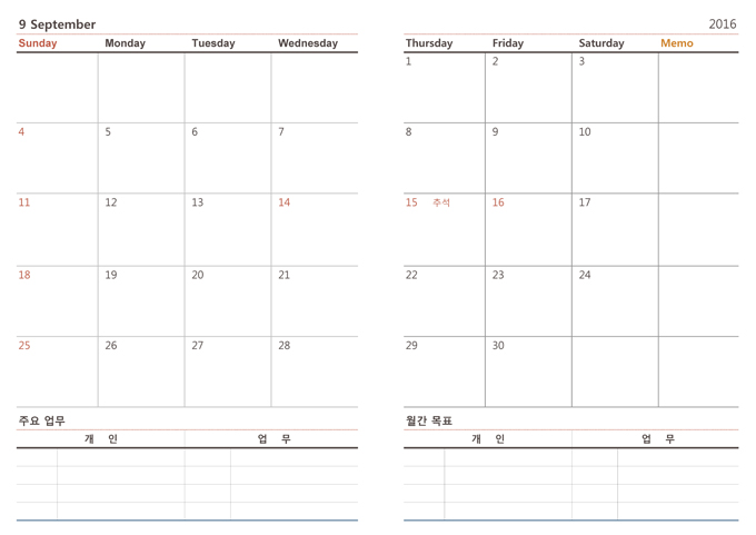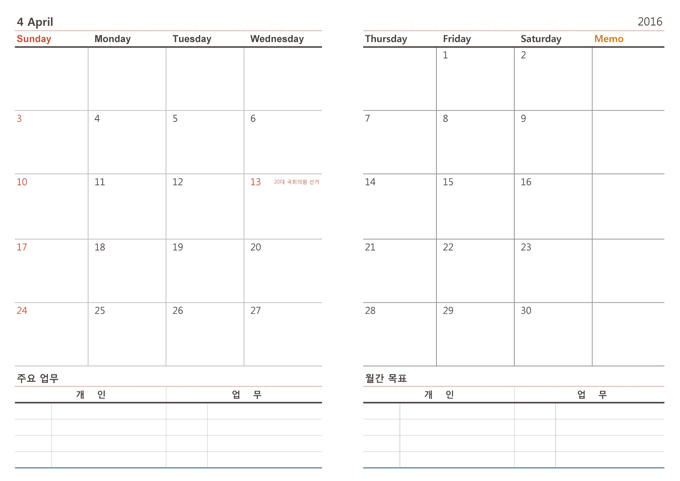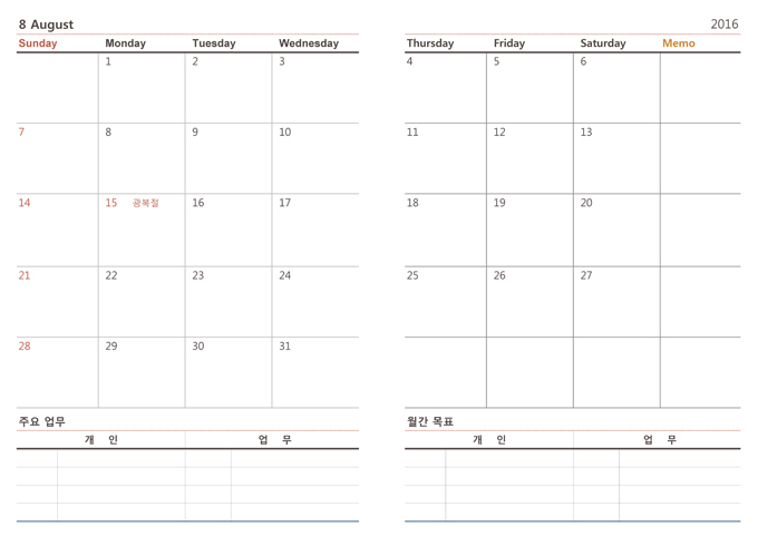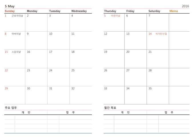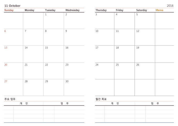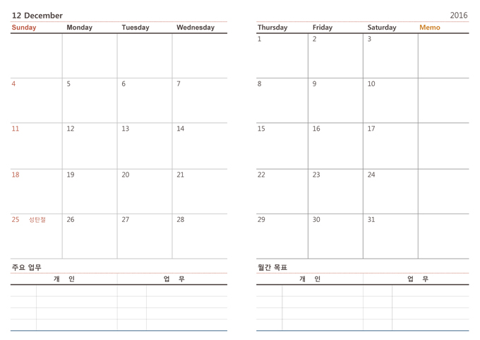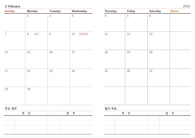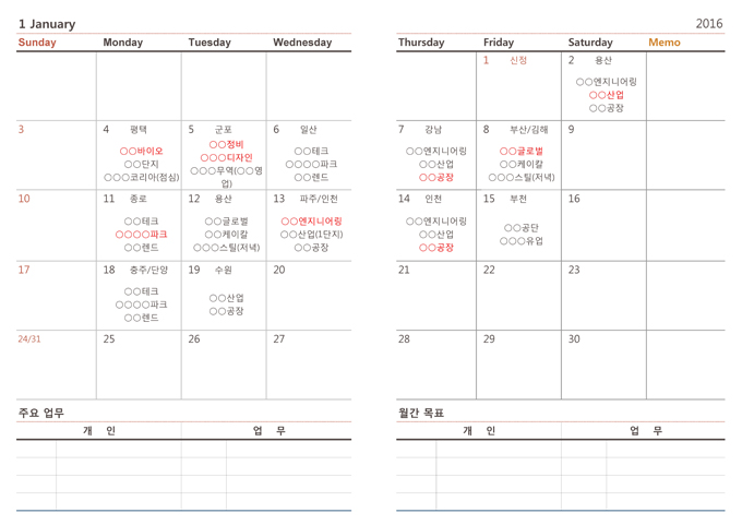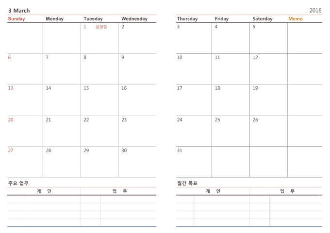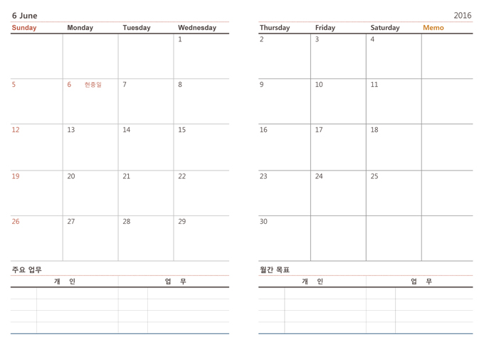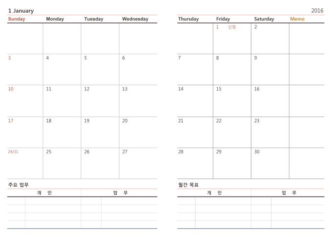 2016년 달력(월별일정,업무관리)입니다. 달력과 동시에 업무관리도 할 수 있는 일석이조의 달력입니다. 깔끔한 달력으로 사무용, 업무관리, 일정관리, 영업관리, 미팅관리 등을 하는데 사용하면 좋습니다. 하단 부분에 주요업무, 월간 목표, 개인 또는 업무 내용을 작성할 수 있어 효과적으로 사용하실 수 있습니다. 업무관리 달력을 통해 일의 효율성을 높여보세요. 월간일정, 월별달력, 일정관리, 스케줄관리에 효율적으로 사용할 수 있습니다.
