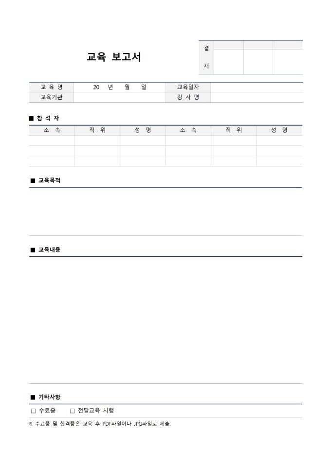 9,000원/월교육 보고서(교육유효성 평가)입니다. 참석자 정보, 교육목적, 교육내용, 기타사항 등으로 구성되어 있습니다.
