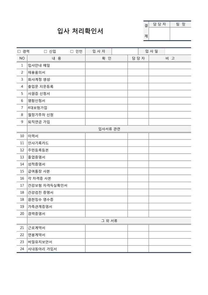 입사처리확인서입니다. 입사 시 필요한 서류, 필요입사 서류 등을 작성하여 관리하는 문서입니다.