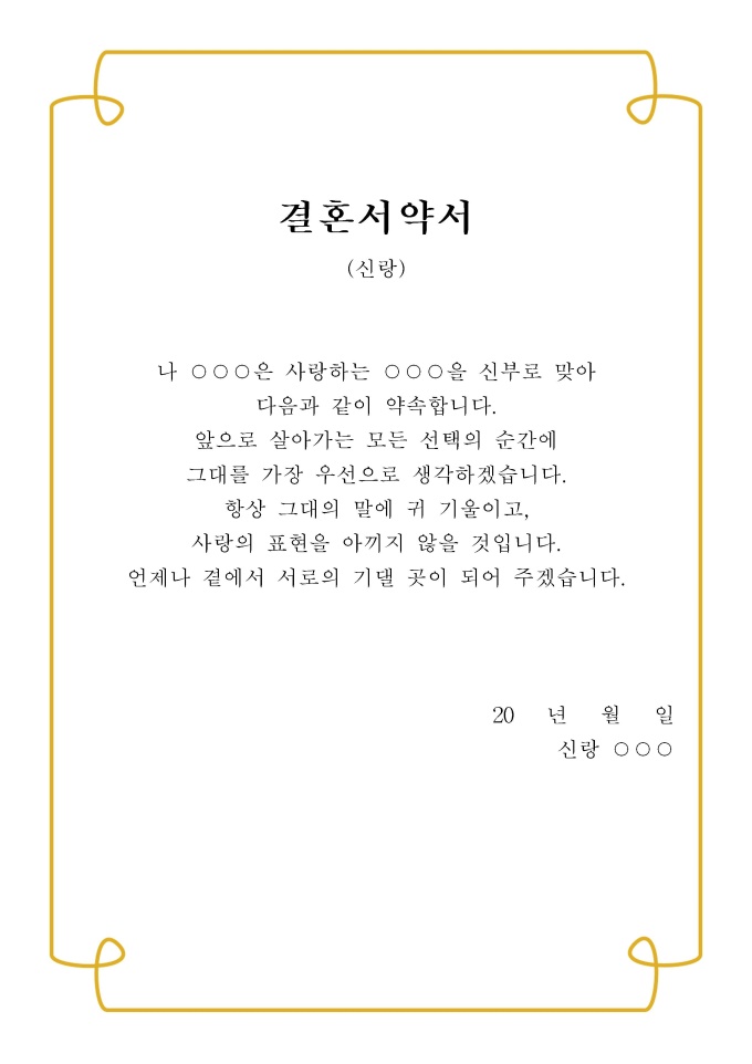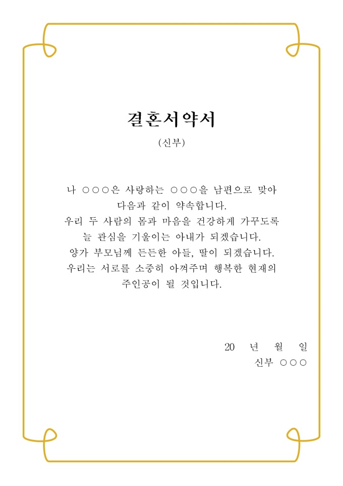 9,000원/월결혼서약서(신랑,신부)입니다. 결혼식에서 사용할 수 있는 결혼서약서 입니다. 서로에 대한 사랑과 앞으로의 다짐을 말하는 내용으로 구성되어 있습니다. 깔끔하고 고급스런 골드테두리로 디자인되어 있습니다.
