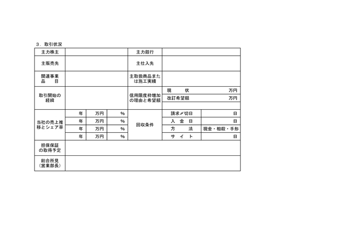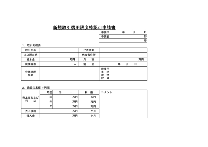 신규거래신용한도틀 인가신청서(일본어)입니다. 신규거래신용한도틀 인가신청서(일본어) 양식이 일본어로 작성된 문서양식입니다. 경리업무, 경리서식 분야에 활용할 수 있습니다. 신규거래신용한도틀 인가신청서(일본어) 양식