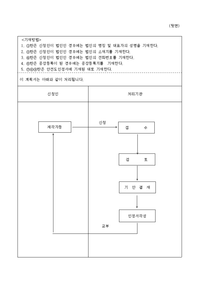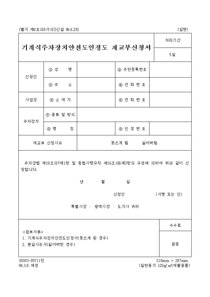 주차장법 제19조의7제1항 및 동법시행규칙 제16조의6제3항의 규정에 의하여 기계식 주차장치 안전도 인정서를 재교부 신청할 때 사용하는 양식입니다.