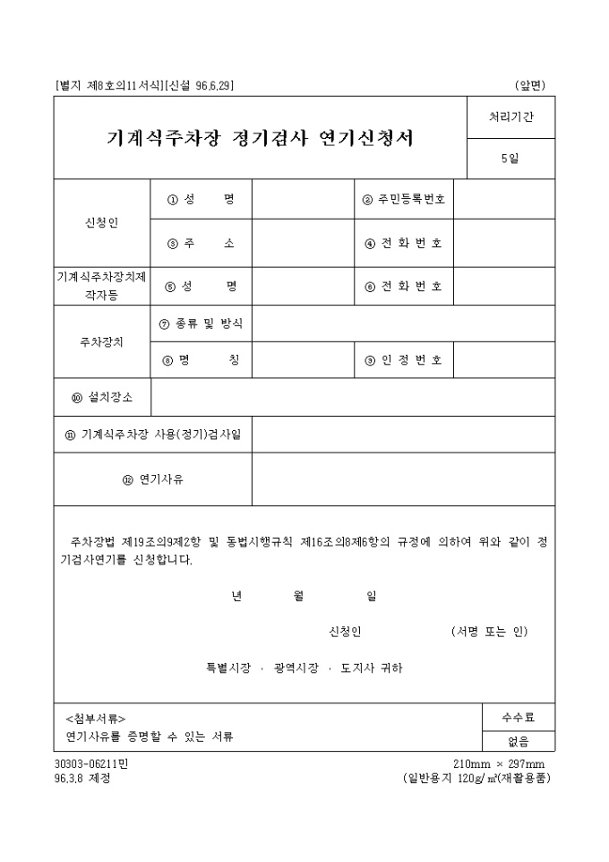 주차장법 제19조의9제2항 및 동법시행규칙 제16조의8제6항의 규정에 의하여 기계식 주차장 정기검사연기를 신청할 때 사용하는 양식입니다.