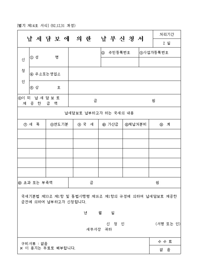 국세기본법 제14호 납세담보에 의한 납부신청서