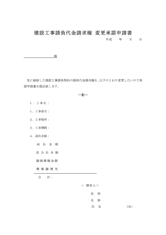 9,000원/월건설 공사 도급 대금 청구권 변경 허락 신청서(일본어)입니다. 건설 공사 도급 대금 청구권 변경 허락 신청서(일본어) 양식이 일본어로 작성된 문서양식입니다. 일반서식, 일반서식 분야에 활용할 수 있습니다. 건설 공사 도급 대금 청구권 변경 허락 신청서(일본어) 양식