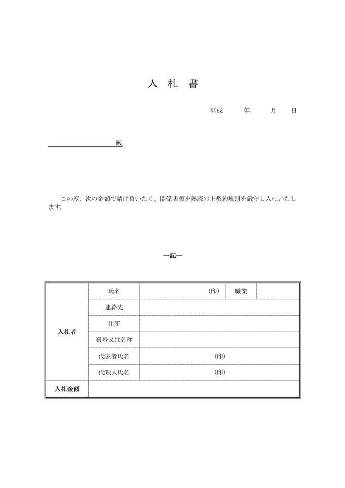 9,000원/월입찰서(건설공사,측량,컨설턴트외)(일본어)입니다. 입찰서(건설공사,측량,컨설턴트외)(일본어) 양식이 일본어로 작성된 문서양식입니다. 일반서식, 일반서식 분야에 활용할 수 있습니다. 입찰서(건설공사,측량,컨설턴트외)(일본어) 양식