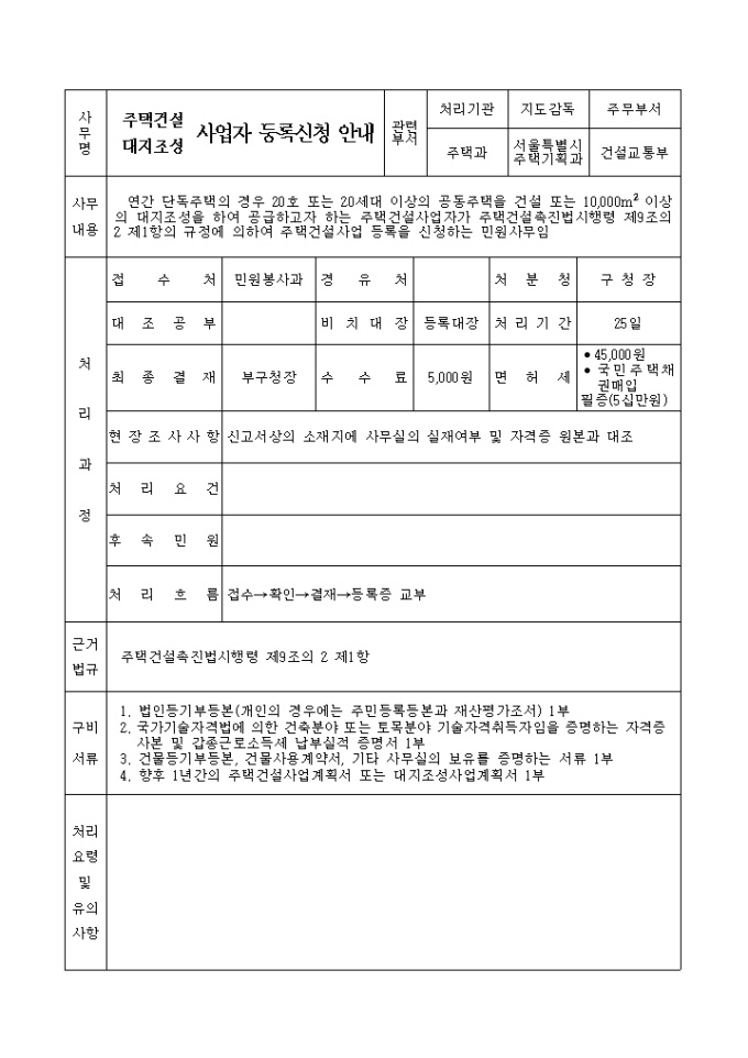 주택건설촉진법시행령 제9조의2 제1항의 규정에 의하여 (주택건설, 대지조성)사업자로 등록하고자 신청할 때 사용하는 양식입니다.