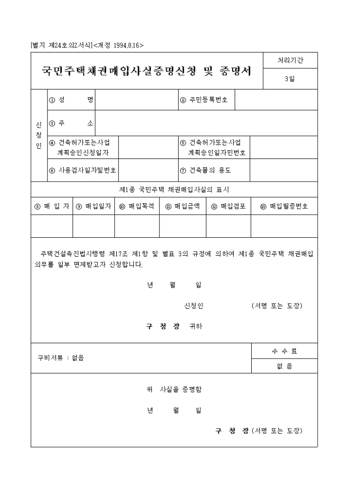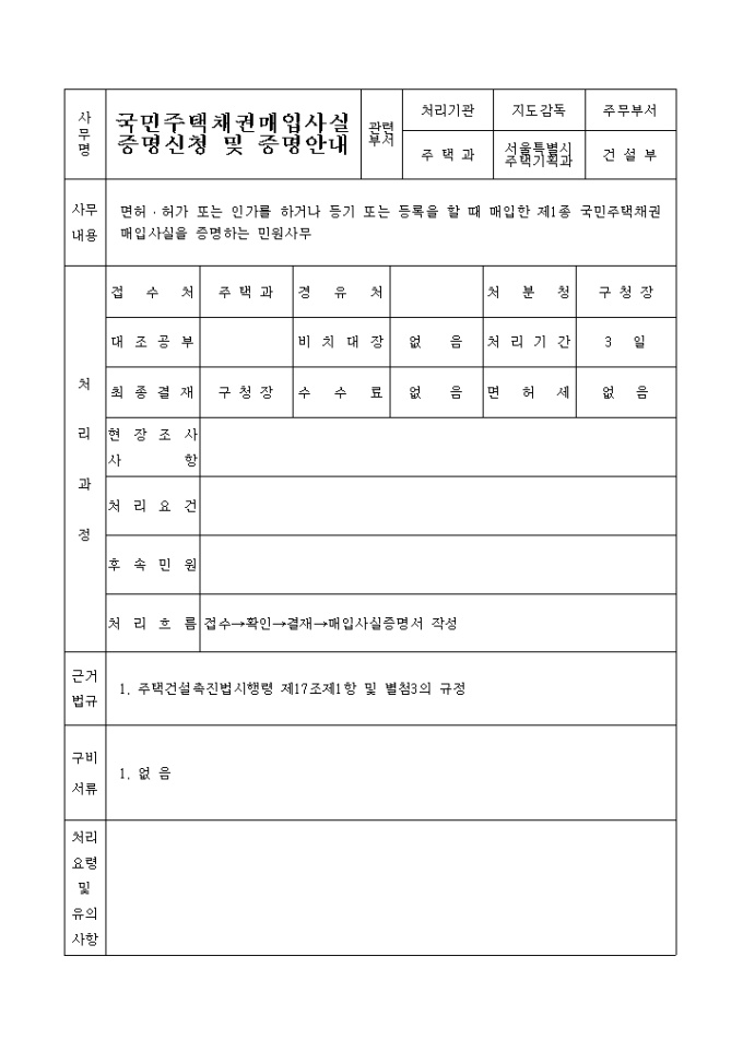 면허․허가 또는 인가를 하거나 등기 또는 등록을 할 때 매입한 제1종 국민주택채권 매입사실을 증명하는 민원사무양식입니다.