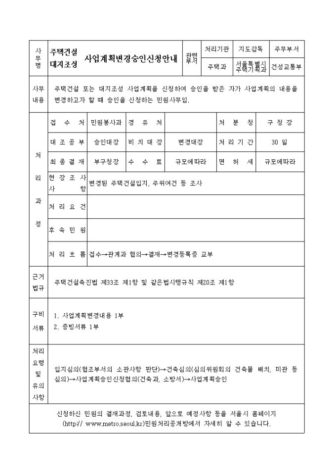 주택건설 또는 대지조성 사업계획을 신청하여 승인을 받은 자가 사업계획의 내용을 변경하고자 할 때 승인을 신청하는 민원사무양식입니다.