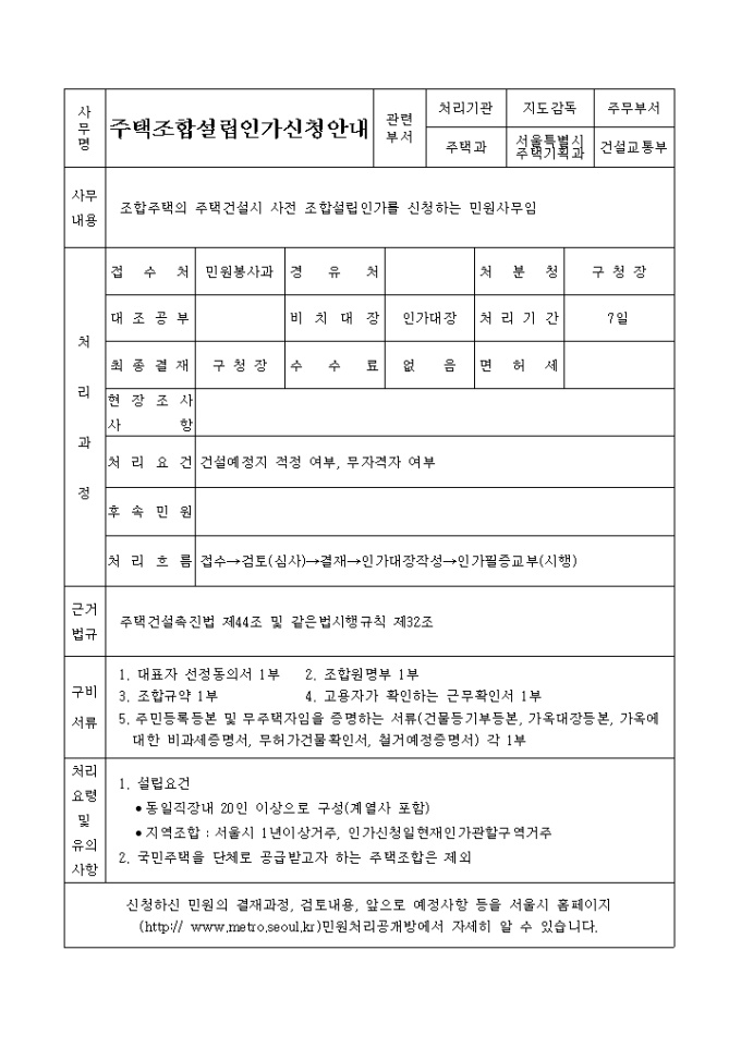 [지제42호 서식] 조합주택의 주택건설시 사전 조합설립인가를 신청하는 민원사무 양식입니다.