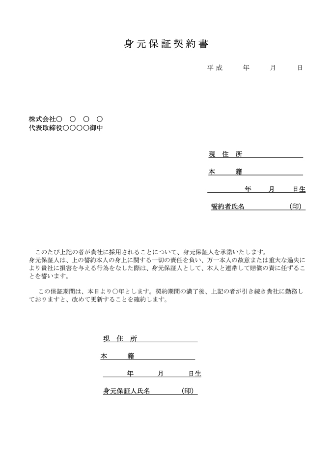 9,000원/월신원보증계약서(일본어)입니다. 신원보증계약서(일본어) 양식이 일본어로 작성된 문서양식입니다. 회사서식, 인사노무 분야에 활용할 수 있습니다. 신원보증계약서(일본어) 양식
