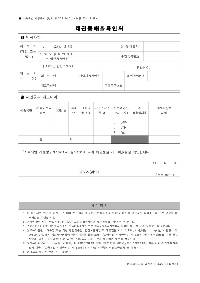채권등매출확인서입니다. 소득세법 시행규칙 별지서식