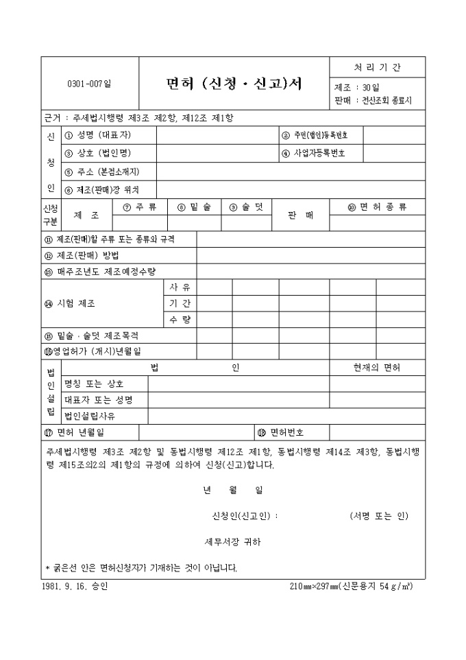 주세법시행령 제3조 제2항 및 동법시행령 제12조 제1항, 동법시행령 제14조 제3항, 동법시행령 제15조의2의 제1항의 규정에 의하여 신청(신고)합니다.