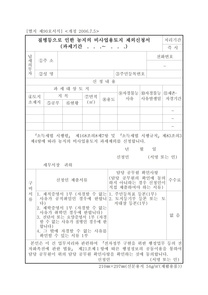9,000원/월질병등으로인한농지의비사업용토지제외신청서입니다. 소득세법 시행규칙 별지서식