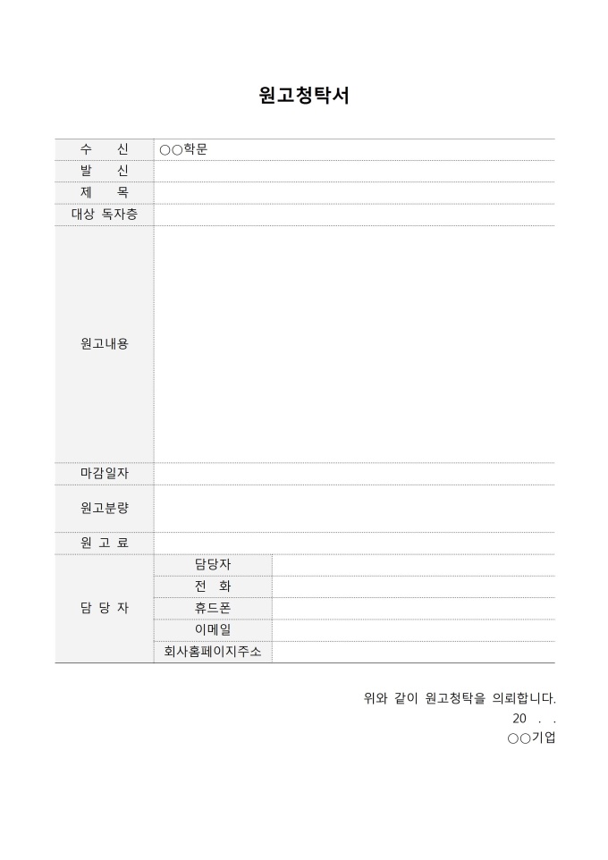 9,000원/월원고청탁서입니다. 수신, 발신, 제목, 대상독자층, 원고내용, 마감일자, 원고분량, 원고료, 담당자 등의 항목으로 구성되어 있습니다.
