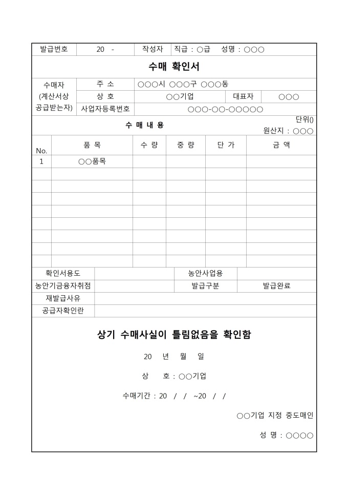 수매확인서입니다. 발급번호, 수매자, 수매내용, 수매내용 확인 등의 항목으로 구성되어 있습니다.