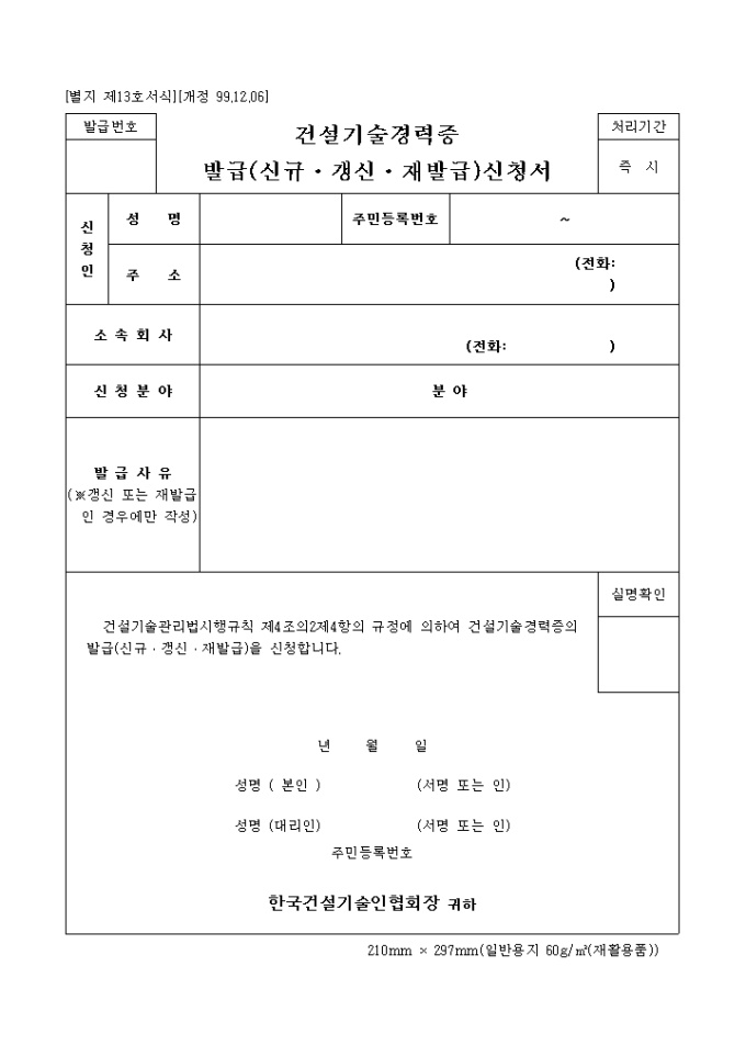 건설기술관리법시행규칙 제4조의2제4항의 규정에 의하여 건설기술경력증의 발급(신규 갱신 재발급)을 신청할 때 사용하는 양식입니다.