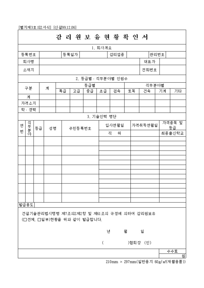 [별지제3호의2서식] 건설기술관리법시행령 제7조의2제2항 및 제61조의 규정에 의하여 감리원보유 (전체, 일부)현황을 발급할 때 사용하는 양식입니다.